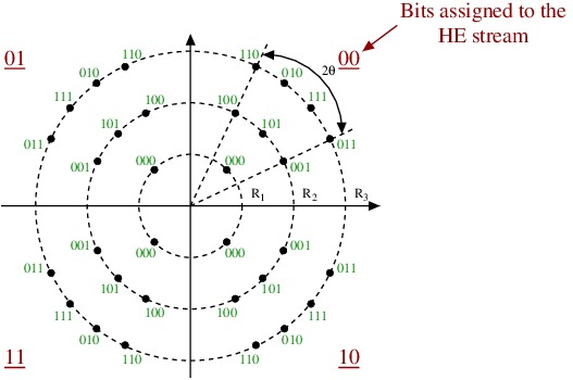 一回の変調/1シンボル で 3bit伝送 するもので 位相変化を8値とする