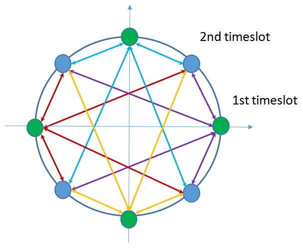 一回の変調/1シンボル 毎に互いに45度/π/4ラジアン 位相の異なるQPSKを交互に用いるQPSK